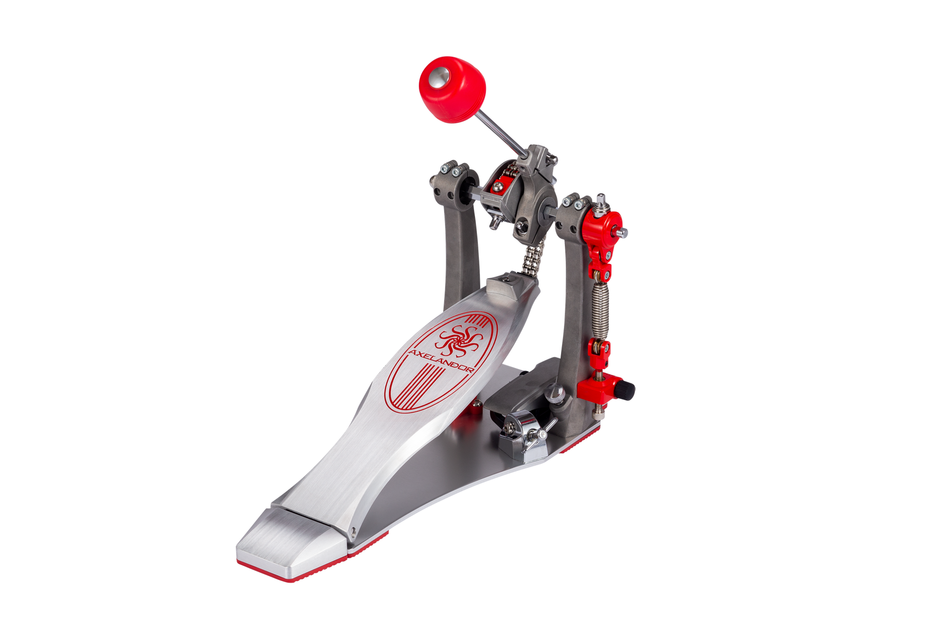 Das Multi-Axle-Kettenabrollsystem, das dem Axelandor Single Pedal seinen Namen verleiht, erlaubt drei verschiedene Einstellmöglichkeiten, die von rund bis exzentrisch reichen. So können Sie selbst entscheiden, ob und wie stark der Beater im letzten Drittel beschleunigt werden soll.