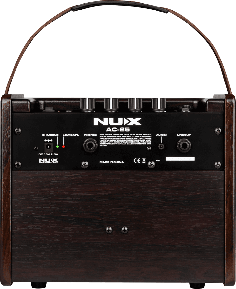 Der Nux AC-25 ist ein akkubetriebener 2-Kanal-Akustiktverstärker. Optimiert für elektroakustische Gitarre und für ein dynamisches Gesangsmikrofon eignet sich der AC-25 perfekt zum Singen mit Gitarrenbegleitung. Seine Leistung von 25 Watt und sein 6,5-Zoll-Lautsprecher sorgen für den nötigen Output zum Proben und kleine Auftritte.