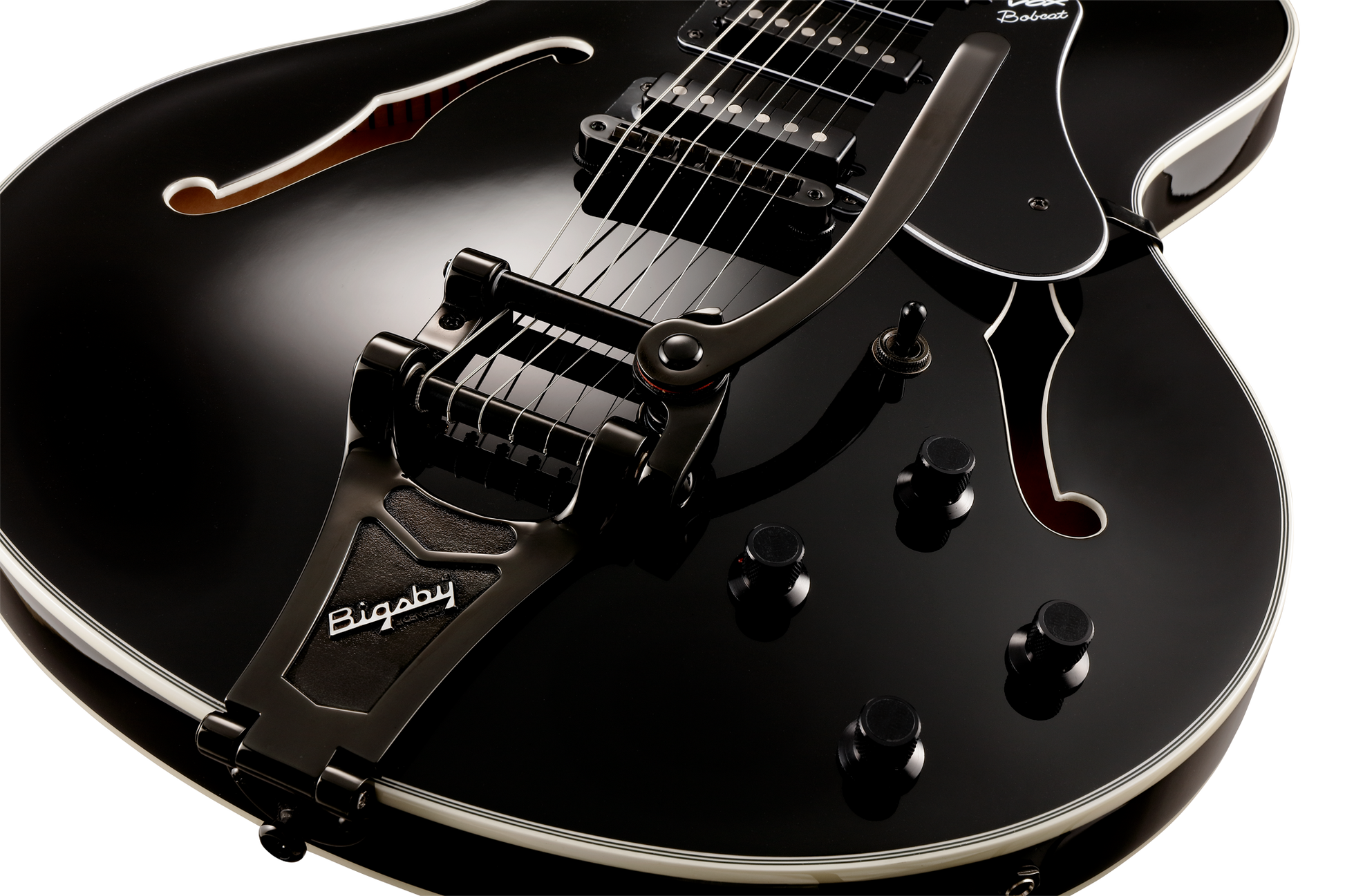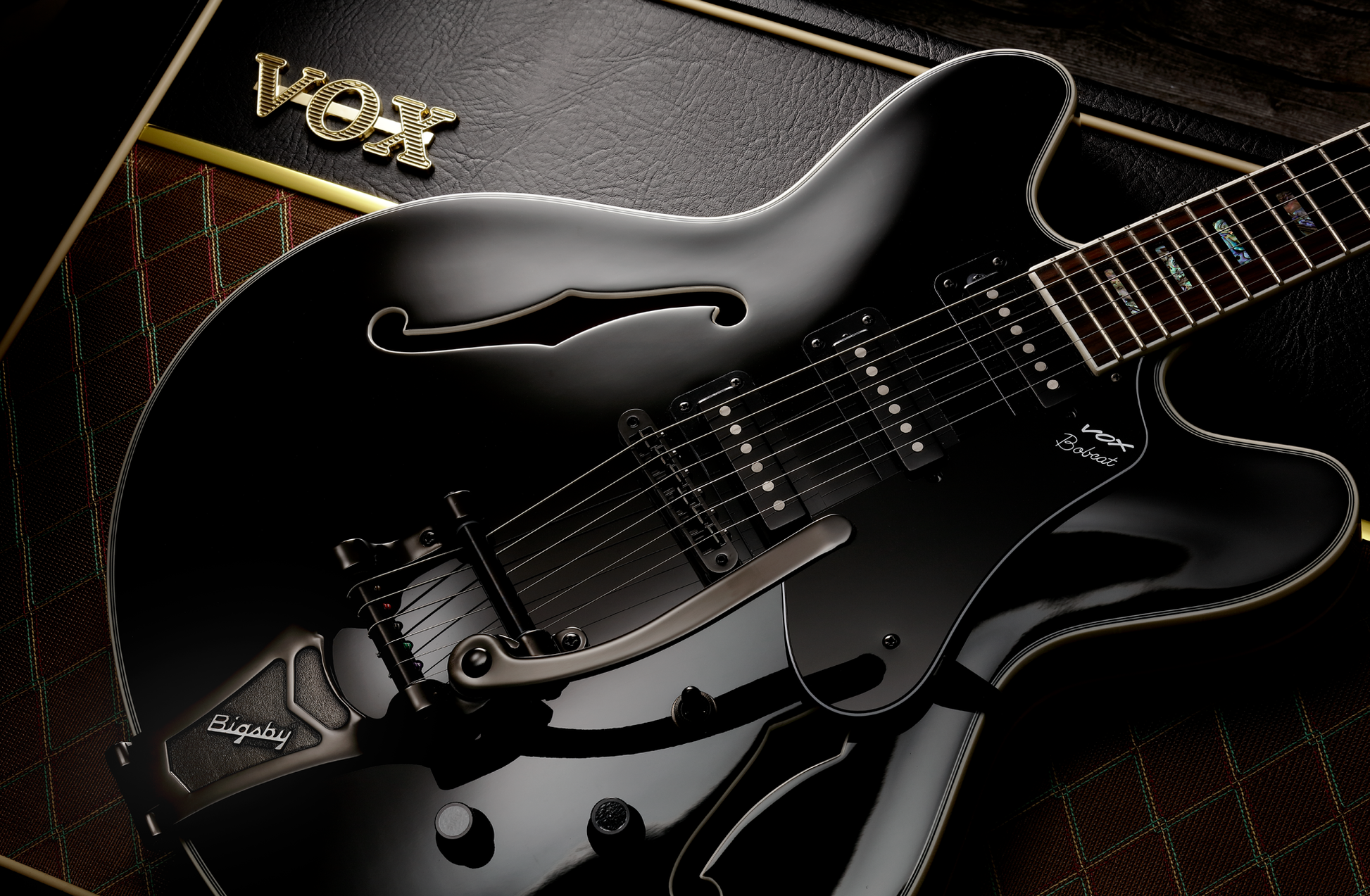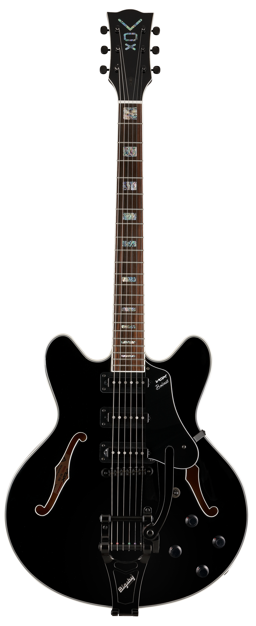 Die semi-akustischen Gitarren der VOX Bobcat Serie sind optisch bis ins Detail ihren klassischen Vorbildern aus den 1960er-Jahren nachempfunden, bieten aber gleichzeitig modernste Features, die man als Gitarrist heute nicht mehr missen möchte. Der Korpus aus Ahorn ist mit einem gewichtsentlasteten Sustainblock ausgestattet, der auch bei hohen Lautstärken übermäßigem Feedback entgegenwirkt. Der Mahagoni-Hals mit Griffbrett aus indonesischem Ebenholz ist eingeleimt und ermöglicht somit ein besseres Sustain sowie eine leichtere Bespielbarkeit, insbesondere in den hohen Lagen. Die offenen Stimmmechaniken von GROVER liefern eine hervorragende Stimmstabilität, während die unkonventionelle Tonabnehmerbestückung mit 3 Singlecoils und jeweils eigenem Volume-Regler für eine ungeahnte Vielfalt an eigenständigen Sounds sorgt. Das auffällige BIGSBY Tremolosystem sorgt nicht nur für einen besonders klassischen Look der Gitarre, sondern liefert auch einen leicht präsenteren Gesamtklang. Passend zur Farbe Jet Black ist das BIGSBY System ebenfalls in Schwarz gehalten, was der Gitarre ein besonders edles und gleichzeitig rockiges Äußeres verleiht.