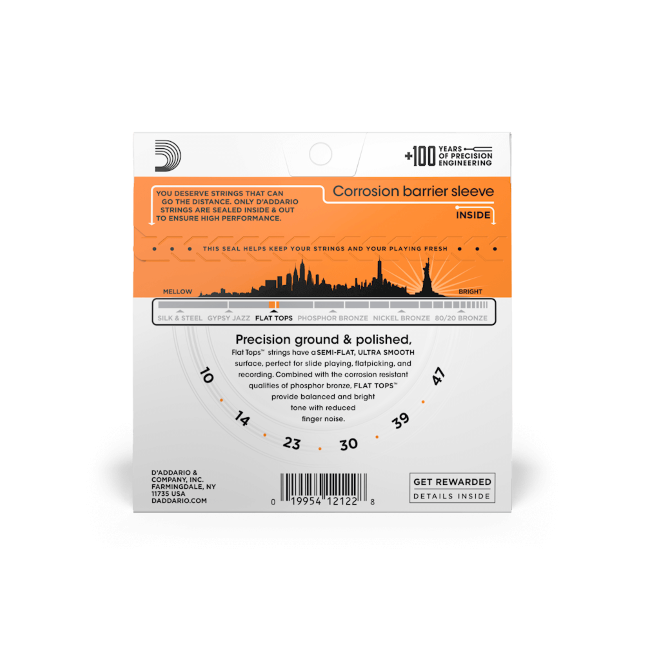 • Die D‘Addario Flat Top Saiten werden in einem recycelbaren VCI-Beutel geliefert, auf dem ein Code aufgedruckt ist, über den du dich registrieren kannst, um Players Circle Punkte zu verdienen.