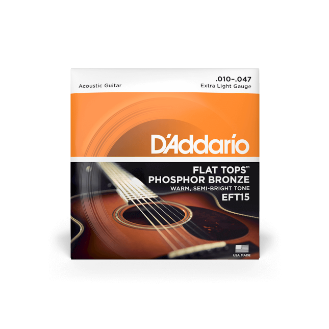 EFT15 Flat Top Saiten verbinden die Vorzüge der beliebtesten Extra-Light-Stärken von D'Addario mit einem exklusiven Präzisionsschleifverfahren für eine glattere, geräuschärmere Spieloberfläche. Hervorragend für Studioaufnahmen oder Slide.