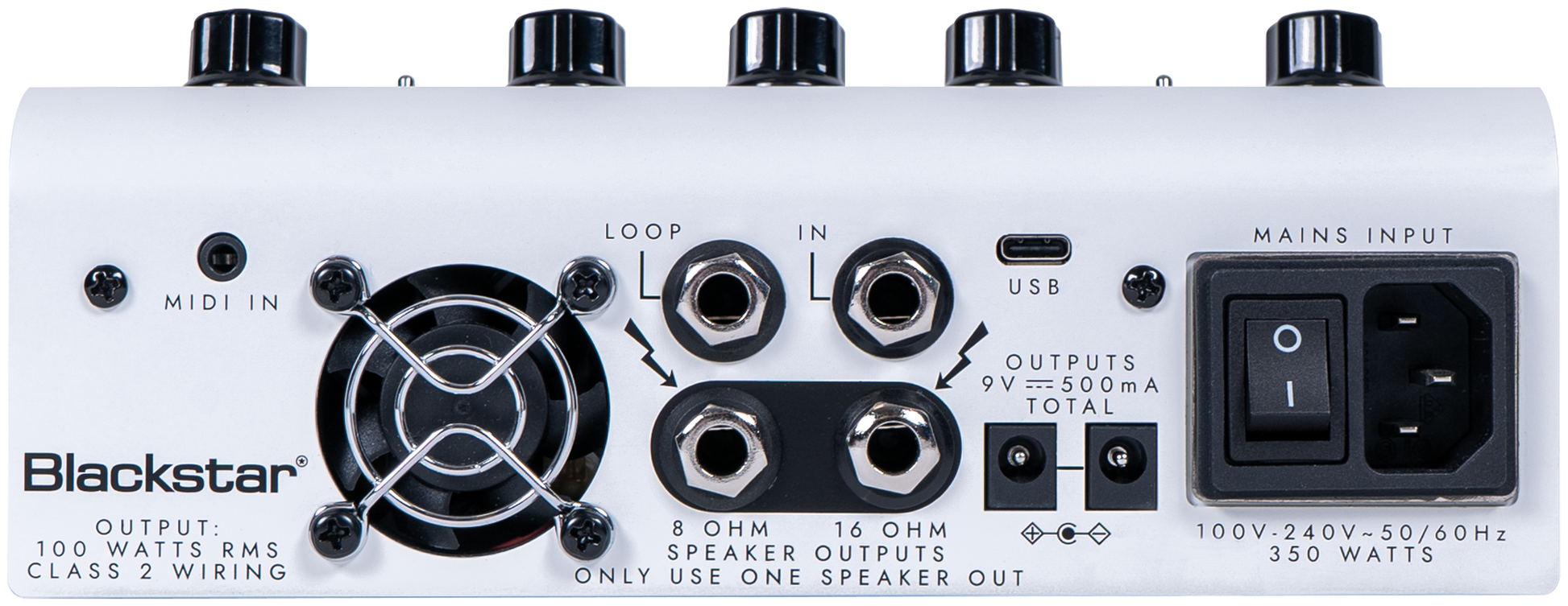 • Anschlüsse: Input, Loop, Speaker Outputs, 2 x 9V DC Outputs, Midi In, USB, Line Out, D.I.