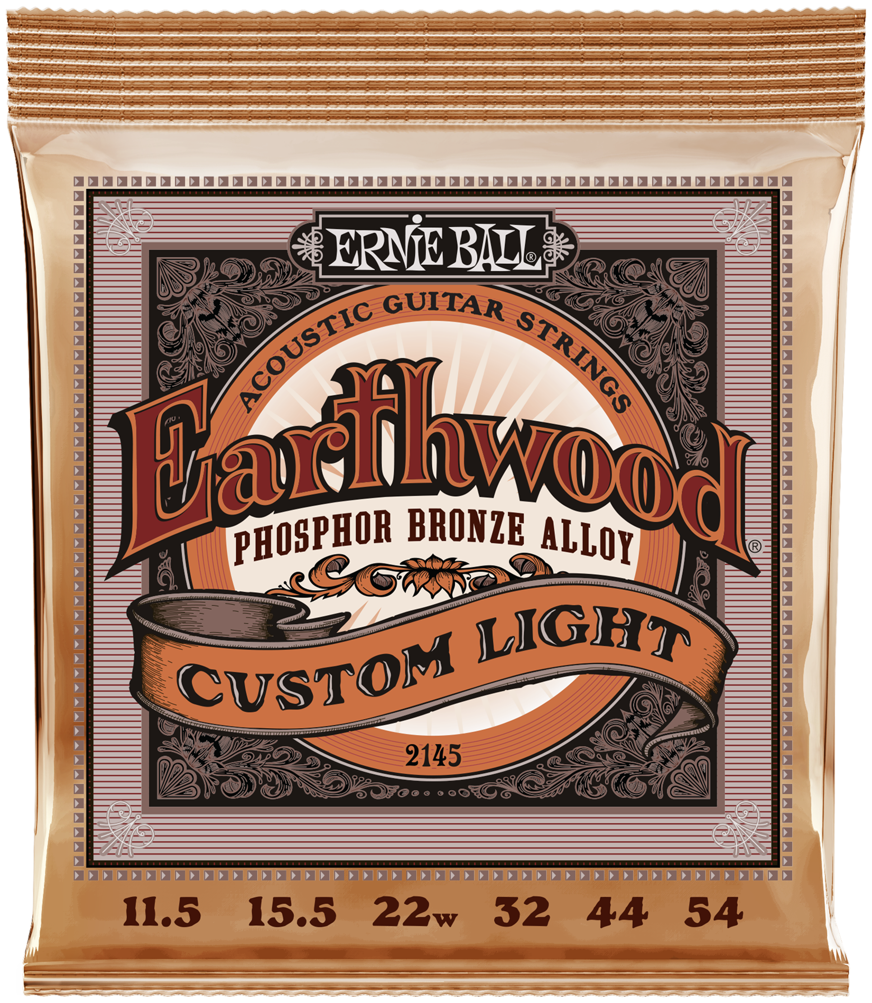 Earthwood Phosphor Bronze Saiten bestehen aus einem Wickeldraht aus 92% Kupfer, 7,7% Zinn und 0,3% Phosphor um einen verzinnten, sechskantigen Stahlkern. Ihre Farbe ist hell orange-gold und ihr Ton weich, glockig und sehr klar.