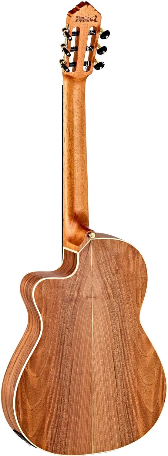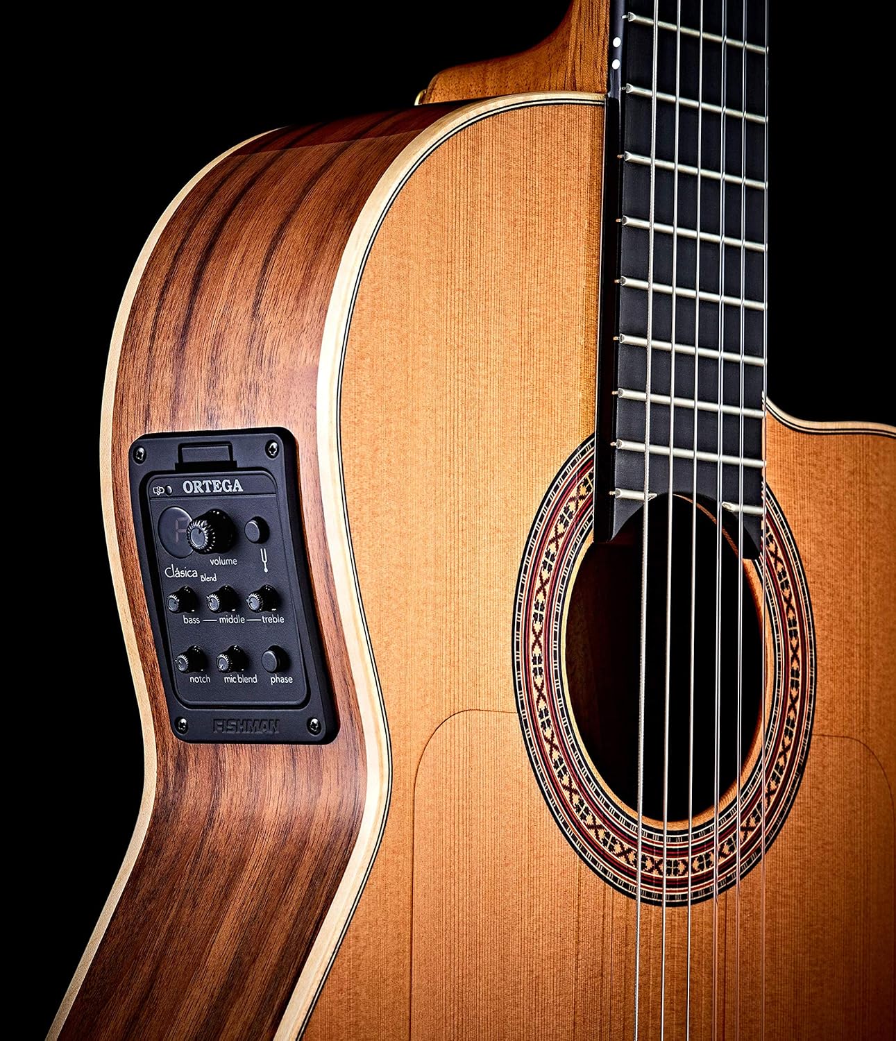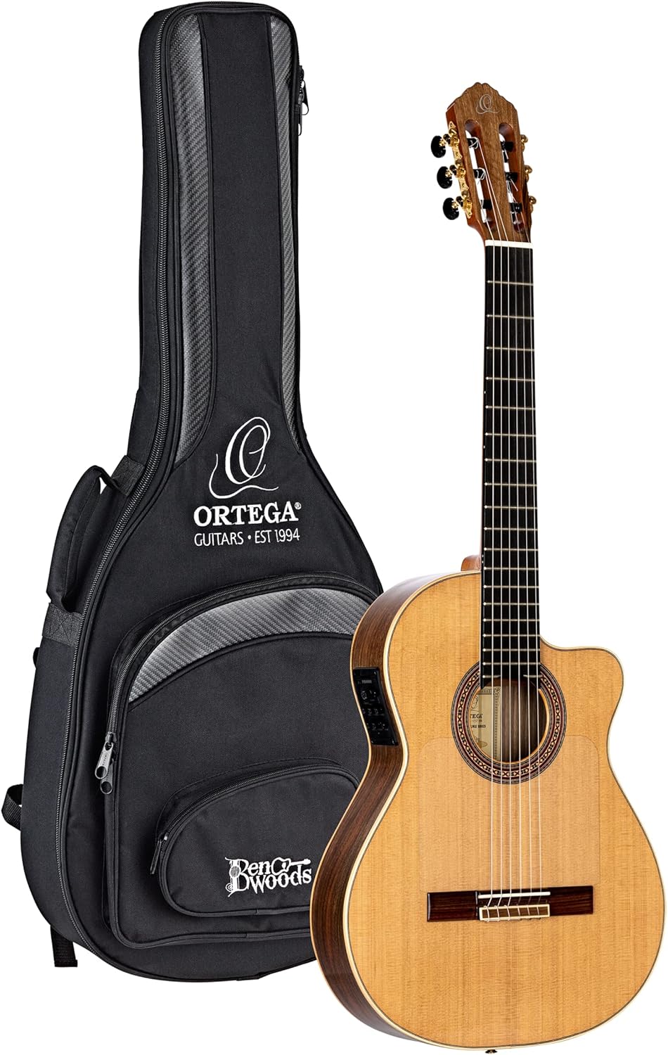 Die Neuauflage einer Flamenco-Gitarre mit High-End Features Ortega Guitars Künstler Ben Woods wünschte sich für seine neue Signature-Gitarre eine klassische Flamenco-Holz Kombination mit modernster High-End Ausstattung. Das Ergebnis ist eine vollmassive Thinline-Gitarre in Hochglanz mit einer Decke aus Western Cedar und Boden/ Zargen aus European Walnut, einem Ebony Griffbrett, einer Ortega 12-Hole-Bridge und einem Fishman/Ortega Clasica Blend Tonabnehmersystem. Alles in Allem ist diese Gitarre ein Arbeitstier, welches sowohl für klassische als auch moderne Flamenco-Stilistiken verwendet werden kann. Die Gitarre wird mit einem Signature Gigbag und einem elektrostatischen Schlagbrett geliefert.