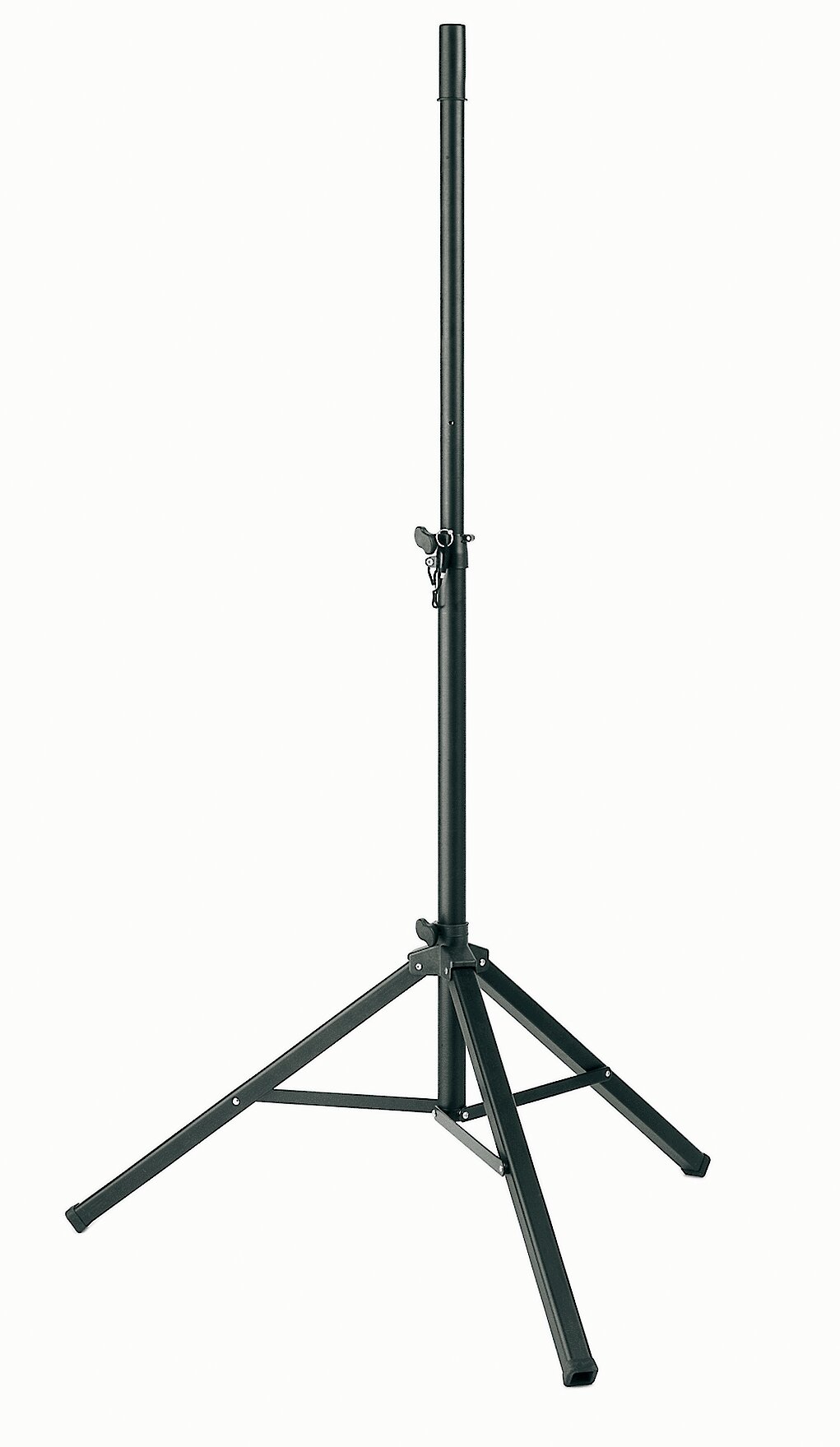 Leichtes Aluminium-Boxenstativ, schwarz, bis 35 kg belastbar, Sicherheitssplint am Auszugsrohr garantiert sicheren Halt.
