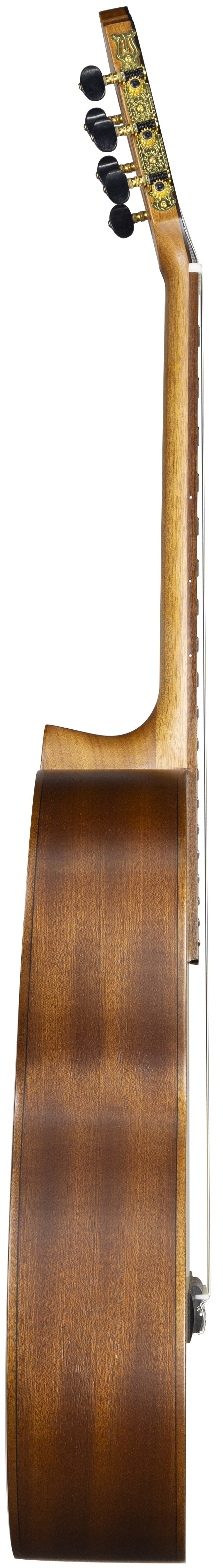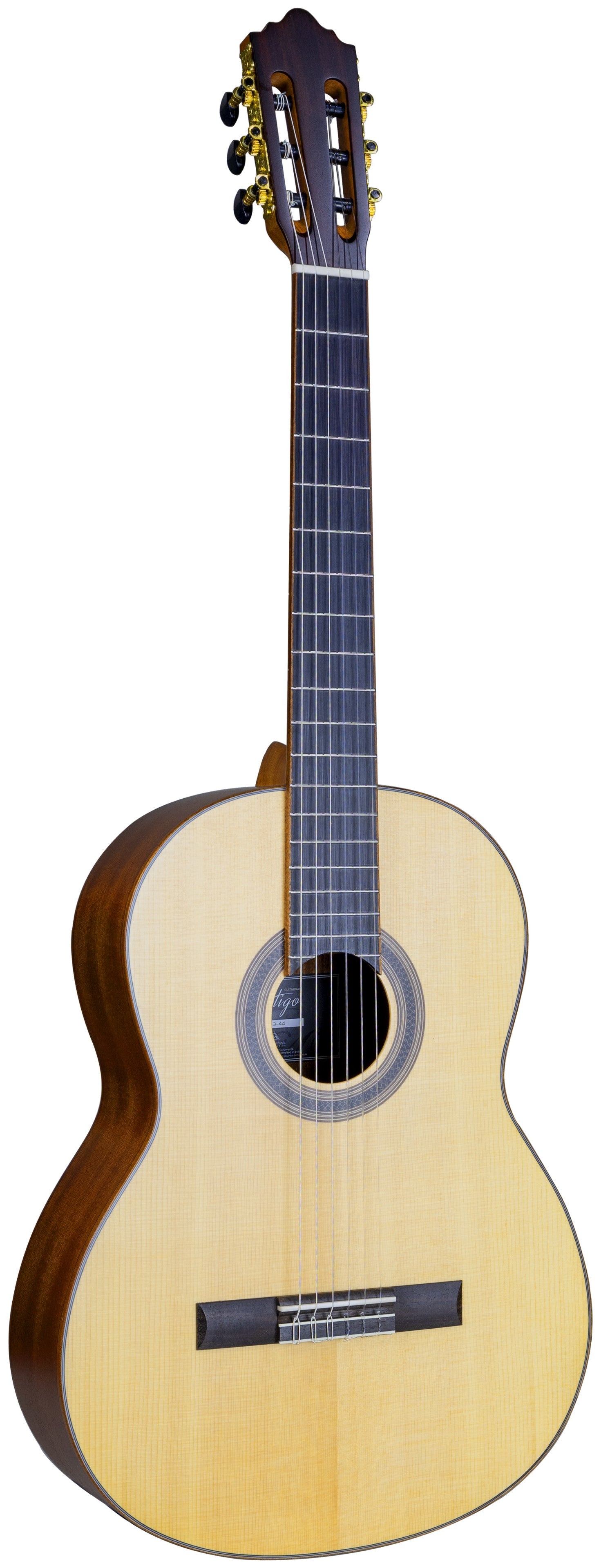 Mit der C-103 mischt Contigo die Einsteigerklasse gehörig auf. Satter, lauter Ton, der nichts an Präzision vermissen lässt und eine tolle Bespielbarkeit stehen hier einem unglaublich guten Preis gegenüber. Der Mahagonihals ist bereits 3-teilig, was Stabilität bringt und eigentlich erst bei weit teureren Gitarren verbaut wird. Die Round Edge Frets und das eingefasste Griffbrett bieten einen Spielkomfort, der in dieser Klasse seinesgleichen sucht. Dazu ist auch der optische Eindruck der Gitarre weit höher als der Preis am Ende verlangt, denn ein edles Sapelle Binding umfasst den formschönen, seidenmatten Body. Die massive Fichtendecke bringt klare Höhen, ausgewogene Mitten und Bässe und eine knackige Ansprache. Der wohl perfekte Einstieg in die Welt der massiven Decken bei der Konzertgitarre.